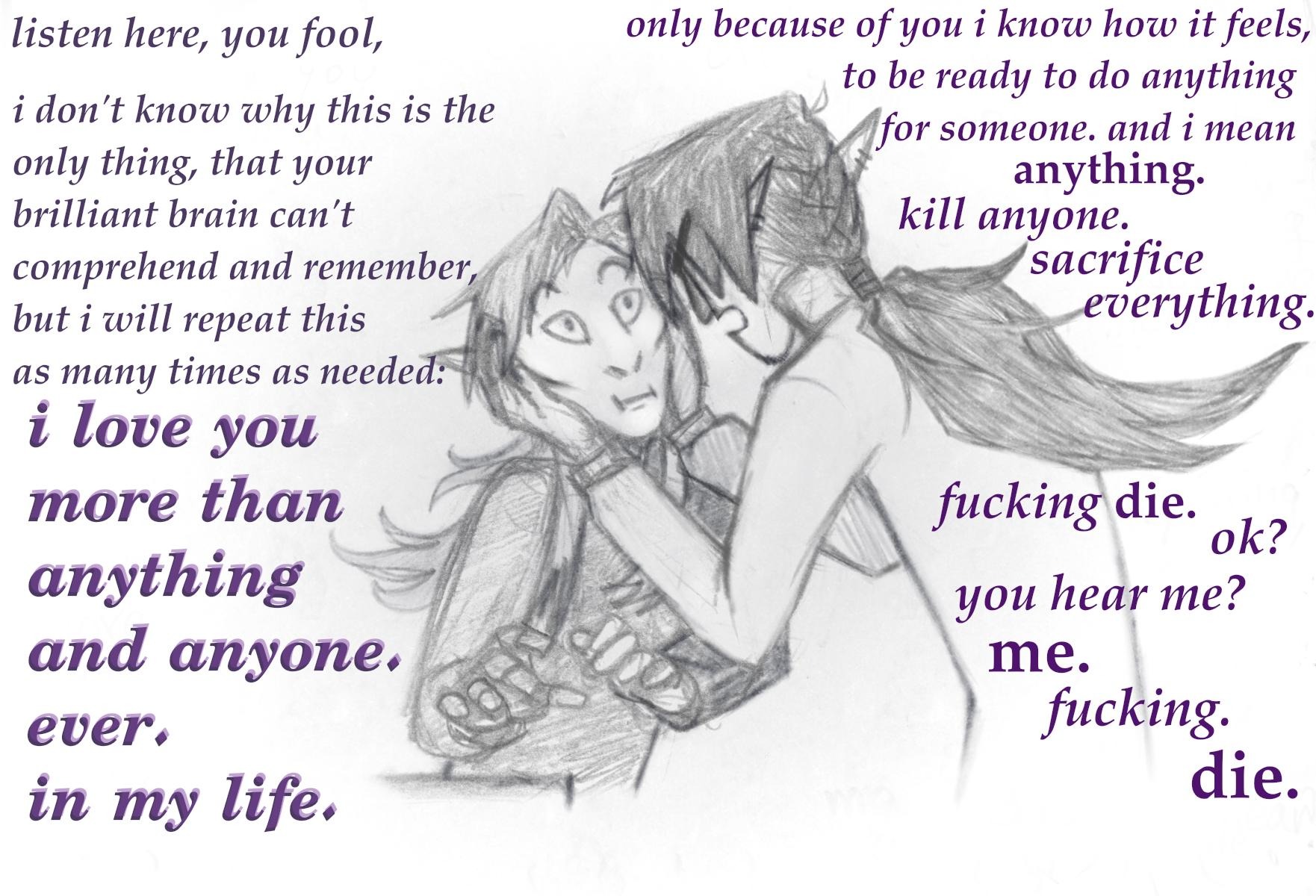 He: [тут Він типу видихне ну типу як «ну шо ти, блін»], I do not doubt your ability to do fine without my help. [9___9] And I’m not sure if you remember or ever noticed it, I guess not, but I never do or don’t do anything because I have to. I do whatever the fuck I want. That’s the whole point of choosing this [він так має руками розвести, типу, в їбучих єбєнях - в скайрімі] as a place to live! [пафос скінчився]. And, okay, sometimes i do stuff I have to do, but only if it coincides with what I want. So no, I do not have to- and yes, you don’t need it. And that has nothing to do with my offer. I – want, you – can. Your choice. [всередині він конєшно типу «так так так так будьласка скажи так скажи так скажи так ну кажи так ну шо ти ну давай давай кажи так шо тут думать погоджуйся скажи так скажи так»].